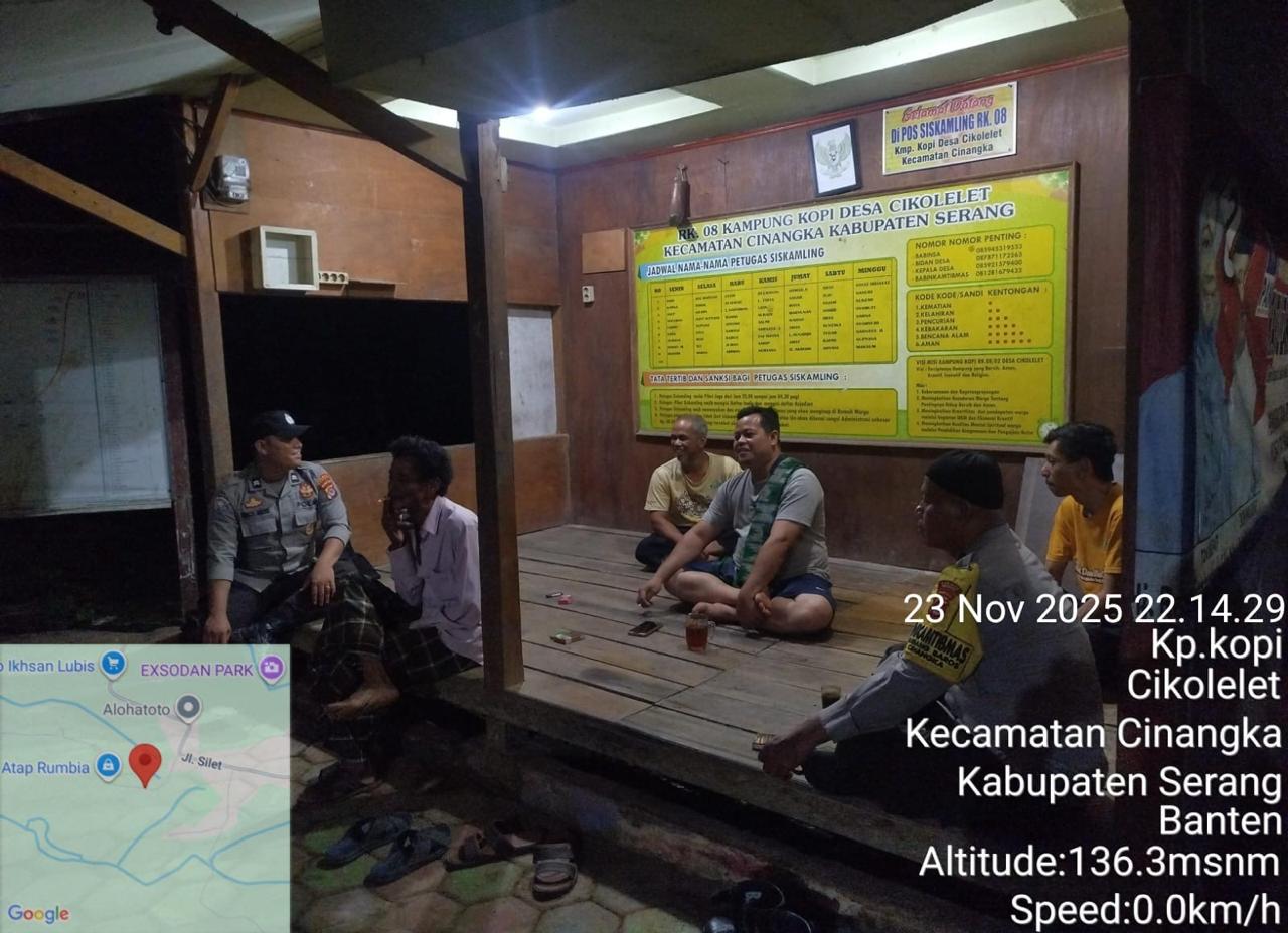 *Polres Cilegon* || Personil Bhabinkamtibmas Polsek Cinangka melaksanakan Program Komandan Wish Kapolda Banten RONDA SATKAMLING menyampaikan komunikasi dengan Petugas Siskamling agar berperan aktif dalam menciptakan Harkamtibmas yang aman dan Kondusif, Senin (24/11/2025).