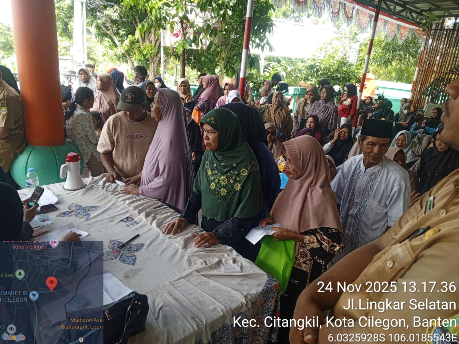 Cilegon - Bhabinkamtibmas Kelurahan Lebak Denok, AIPTU YUDI SETIAWAN, melaksanakan pengamanan dan monitoring bantuan langsung tunai dari Kementerian Sosial RI di Kantor Kelurahan Lebak Denok, Kecamatan Citangkil, Kota Cilegon, Senin (24/11/2025).