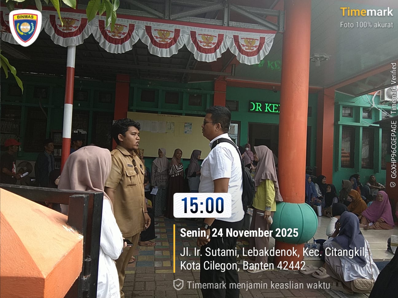Cilegon - Bhabinkamtibmas Kelurahan Lebak Denok, AIPTU YUDI SETIAWAN, melaksanakan pengamanan dan monitoring bantuan langsung tunai dari Kementerian Sosial RI di Kantor Kelurahan Lebak Denok, Kecamatan Citangkil, Kota Cilegon, Senin (24/11/2025).