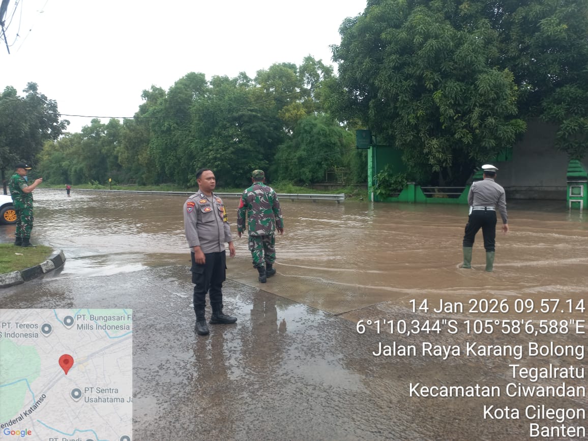 Cilegon - Personil Polsek Ciwandan melaksanakan monitoring genangan air dampak cuaca hujan lebat di wilayah hukum Polsek Ciwandan, Rabu (14/01/2026).