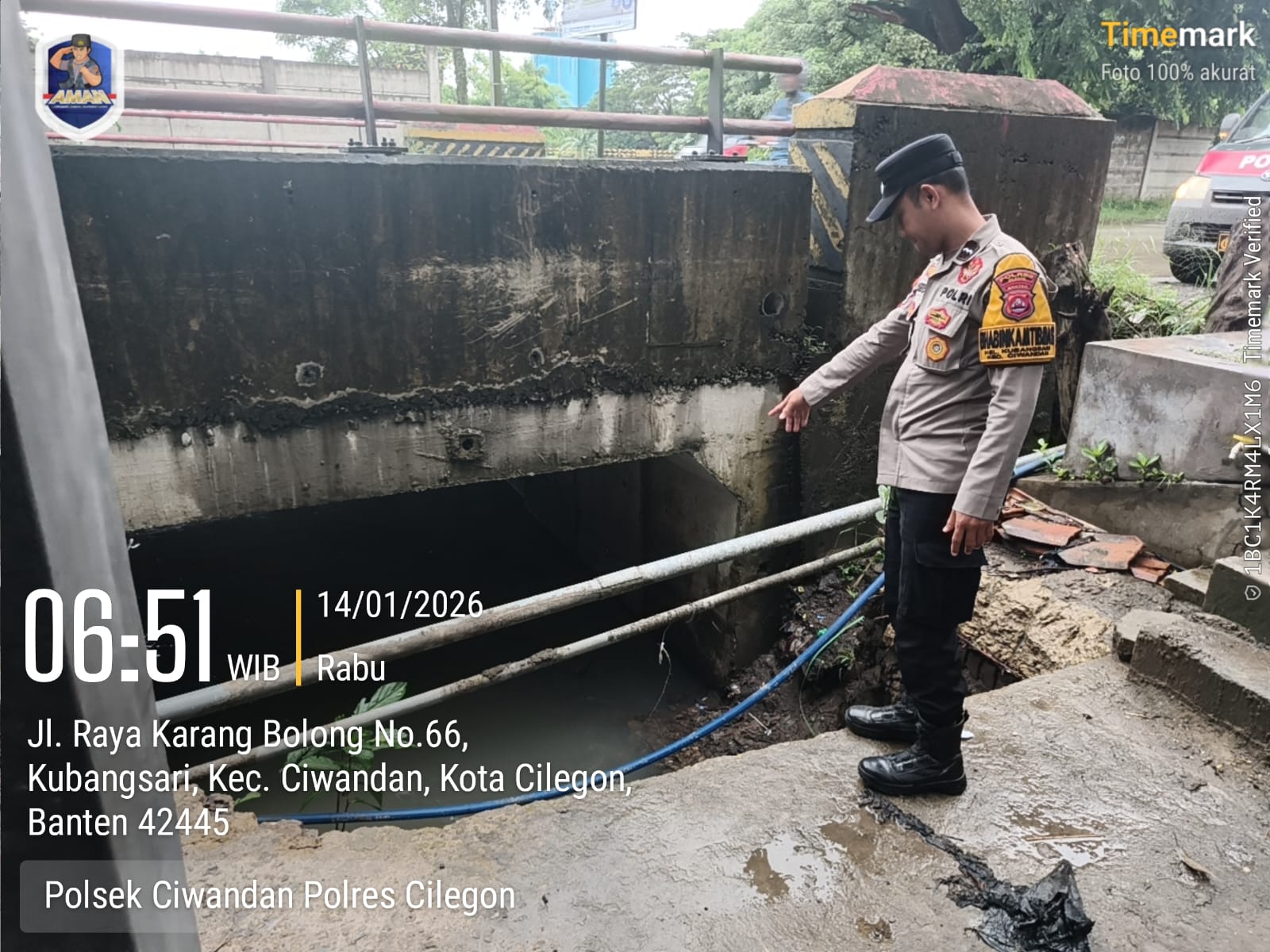 Cilegon - Dalam rangka antisipasi bencana alam personil Polsek ciwandan mengecek debit air di beberapa titik aliran sungai salah satunya yaitu kalimuk RT 005 RW 006 Kelurahan samang Raya Kecamatan citangkil Kota Cilegon, Rabu (14/01/2026).