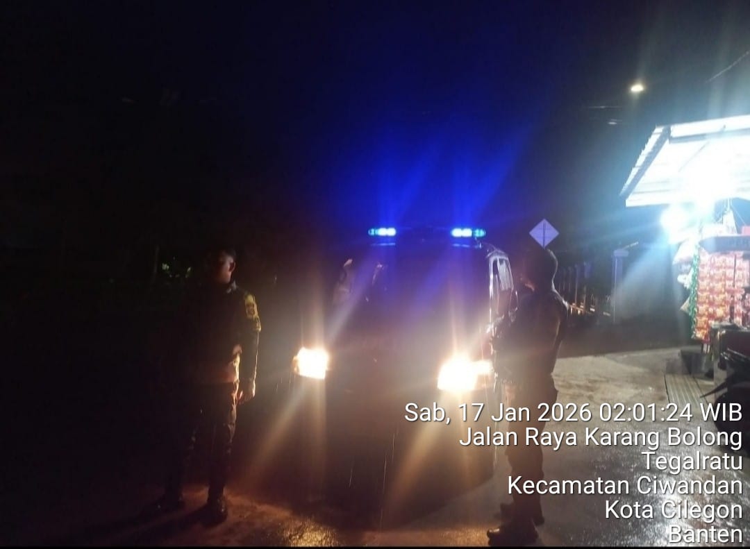 Cilegon - Personil Polsek Ciwandan Polres Cilegon Polda Banten Dalam Pelaksanaan Kegiatan Patroli dengan menyalakan lampu rotator berwarna biru di Daerah Hukum Polsek Ciwandan Polres Cilegon Polda Banten dari malam hingga dini hari, dalam rangka menciptakan situasi aman dan kondusif, Sabtu (17/01/2026).