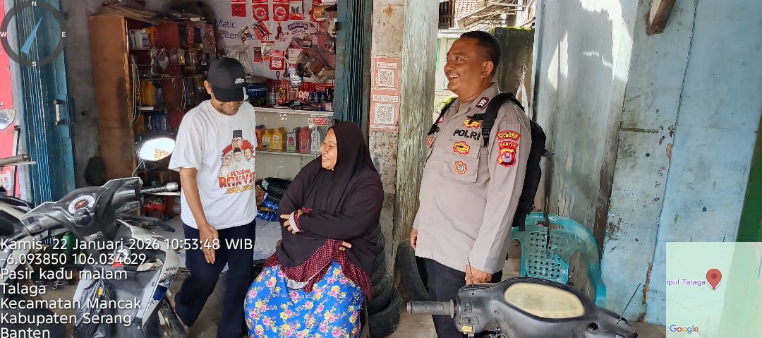 Kapolres Cilegon Polda Banten AKBP Dr. Martua Raja Taripar Laut Silitonga melalui Kapolsek Mancak  AKP ANDI AAS  MARIO Dan  Anggota Bhabinkamtibmas  BRIPKA ARIE SUFRIYADI, BRIGADIR ASEP WINDU SAPUTRA melaksanakan kegiatan sambang serta implementasi Commander Wish Kapolda Banten "WARBINLING" Warung Bhabinkamtibmas Keliling dan Program Commanderwish Kapolres Cilegon "TRENDING" dalam rangka menciptakan situasi aman dan kondusif di daerah hukum Polsek Mancak Polres Cilegon.