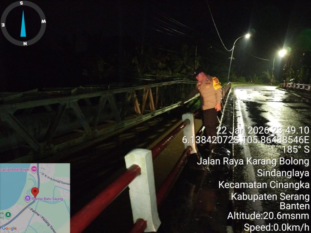 Piket Polsek Cinangka secara rutin melakukan pengecekan kondisi sungai dan berkoordinasi dengan pihak terkait untuk memantau perkembangan debit air. Pemantauan ini juga melibatkan partisipasi aktif dari masyarakat setempat.