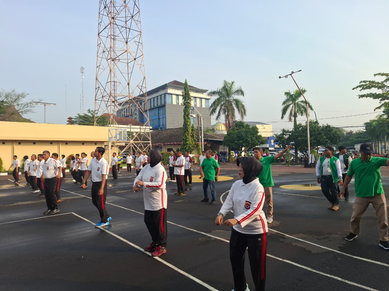 Cilegon,Polres Cilegon Polda Banten Pada Jumat/13/02/2025 Pukul 07.15 Wib, Personil  Polres Cilegon, melaksanakan kegiatan olahraga mandiri di lapangan Polres Cilegon dan melaksanakan senam aerobik di Lapangan polres cilegon.