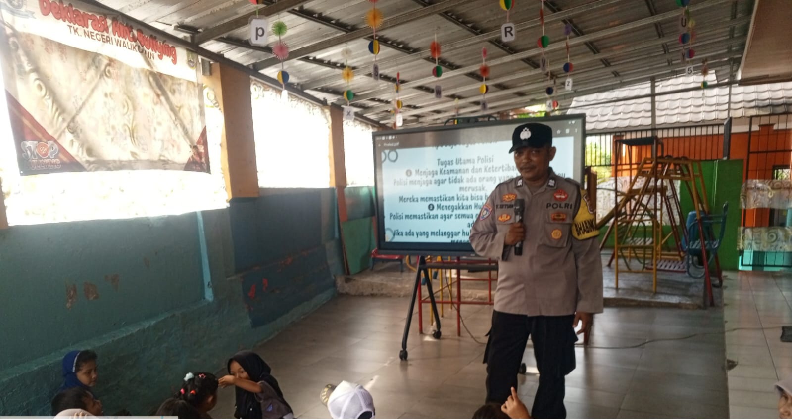 Dalam kesempatan ini, Bhabinkamtibmas Polsek Ciwandan mengajak anak-anak berinteraksi dan Selain itu juga disisipi dengan pengenalan tentang tugas-tugas polisi secara umum.