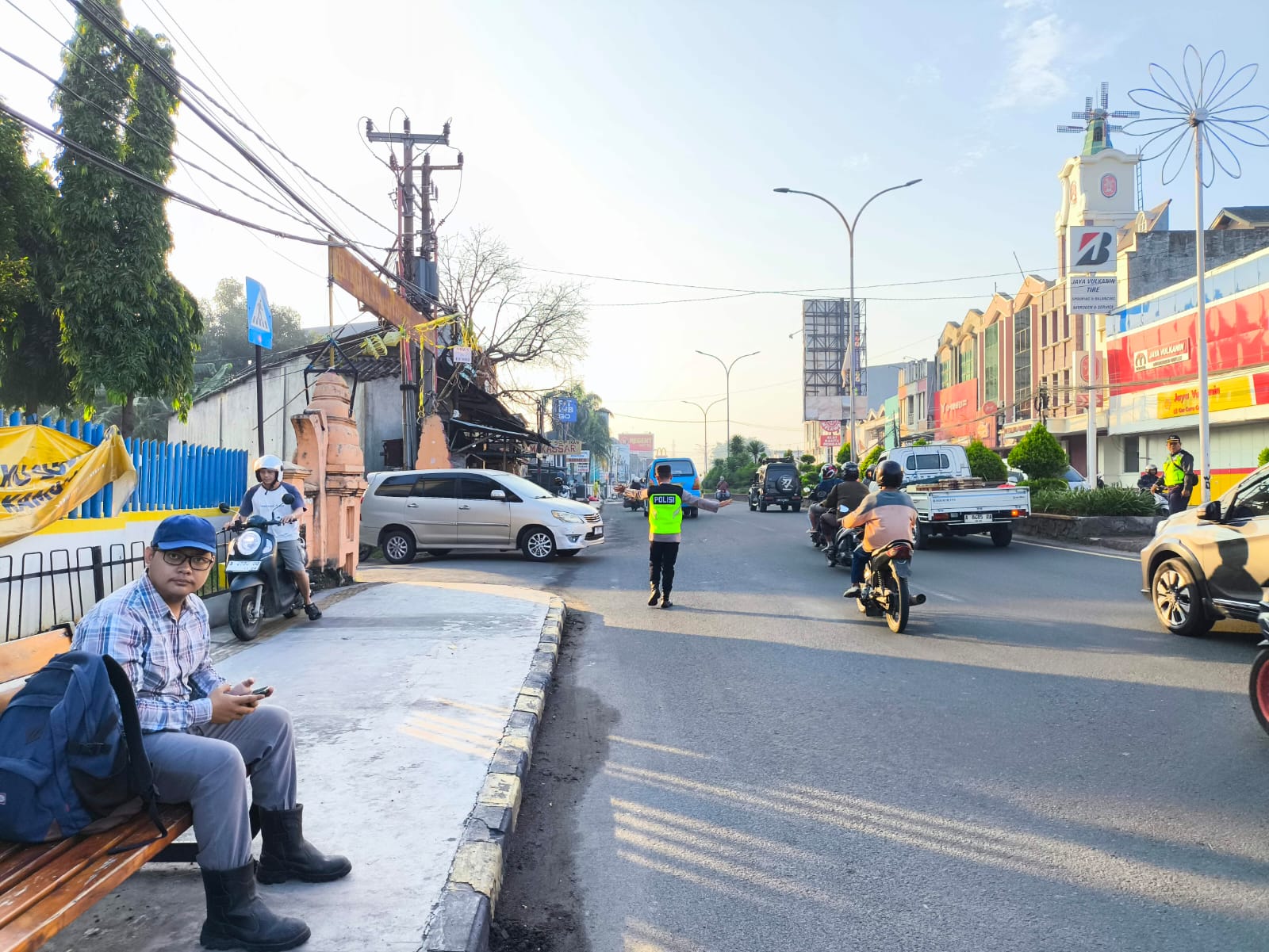 Brigpol Hadi sudrajat selaku Personil Siwas Polres Cilegon Melaksanakan Kegiatan Rutin pengaturan Arus Lalu Lintas di Jalur Protokol jalan Utama Kota Cilegon.