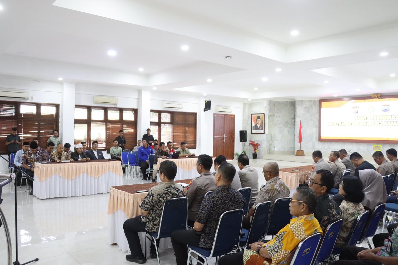 Rapat koordinasi dilaksanakan di bawah penanggung jawab Kapolres Cilegon AKBP Dr. Martua Raja Taripar Laut Silitonga, S.H., S.I.K., M.Si. Kegiatan turut dihadiri Wakapolres Cilegon KOMPOL M. Ridzky Salatun, S.I.K., Wakil Ketua I DPRD Kota Cilegon H. Sohidin, S.H., Wakil Ketua II DPRD Kota Cilegon H. Masduki, Asda II Kota Cilegon H. Dana Sujaksani, S.Sos., M.Si., Danramil Cilegon Mayor Inf Usman, Plt Kadis Ketahanan Pangan Kota Cilegon Novi Yogi, Sekjen MUI Kota Cilegon H. Sutisna Abas, Ketua MUI Kabupaten Serang H. Muhit, Ketua FKUB Kabupaten Serang KH. Komarudin, Head Operation ASDP Merak I Putu Widhiyatamaja, Jr Officer Sc PT Pertamina Tanjung Gerem Achtizen, para PJU Polres Cilegon, Kapolsek jajaran Polres Cilegon, perwakilan SKPD Kota Cilegon, pimpinan instansi terkait, serta pimpinan organisasi keagamaan.