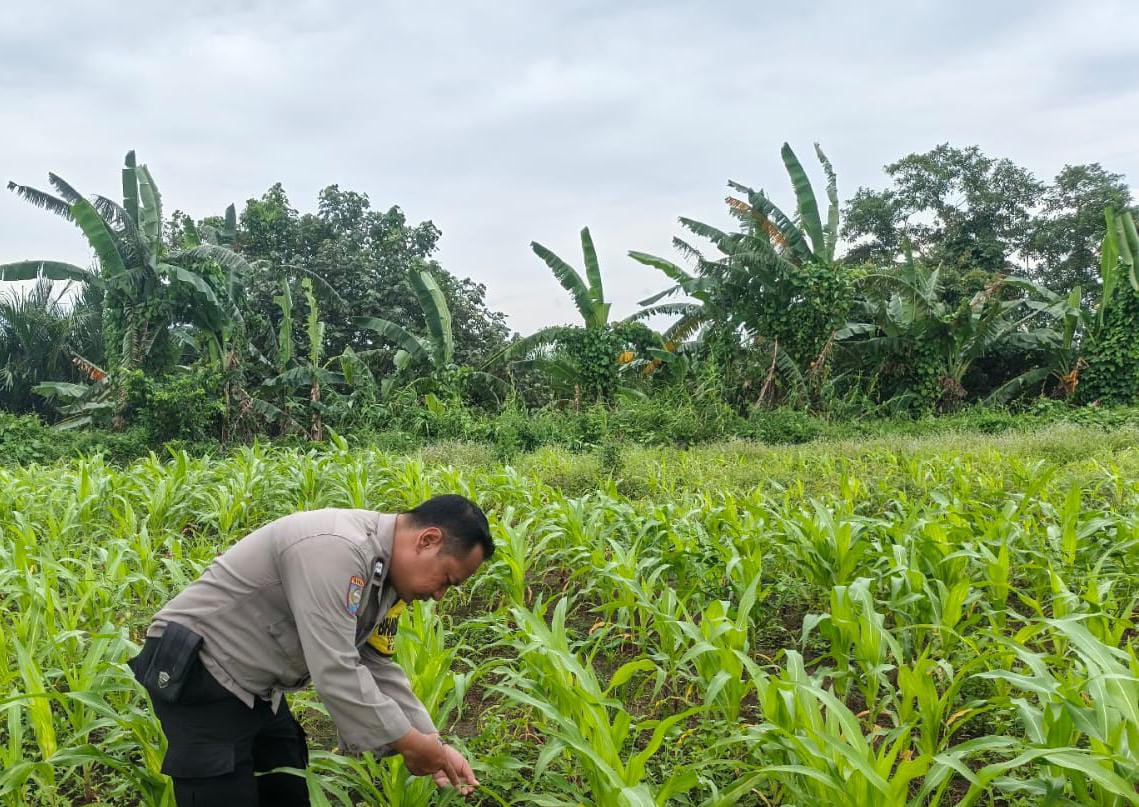 Dalam kegiatan monitoring ini, Bhabinkamtibmas meninjau langsung kondisi lahan jagung.