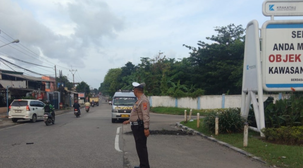 Unit Lantas Laksanakan Pengaturan Arus Lalin di Simpang Beringin Ciwandan.