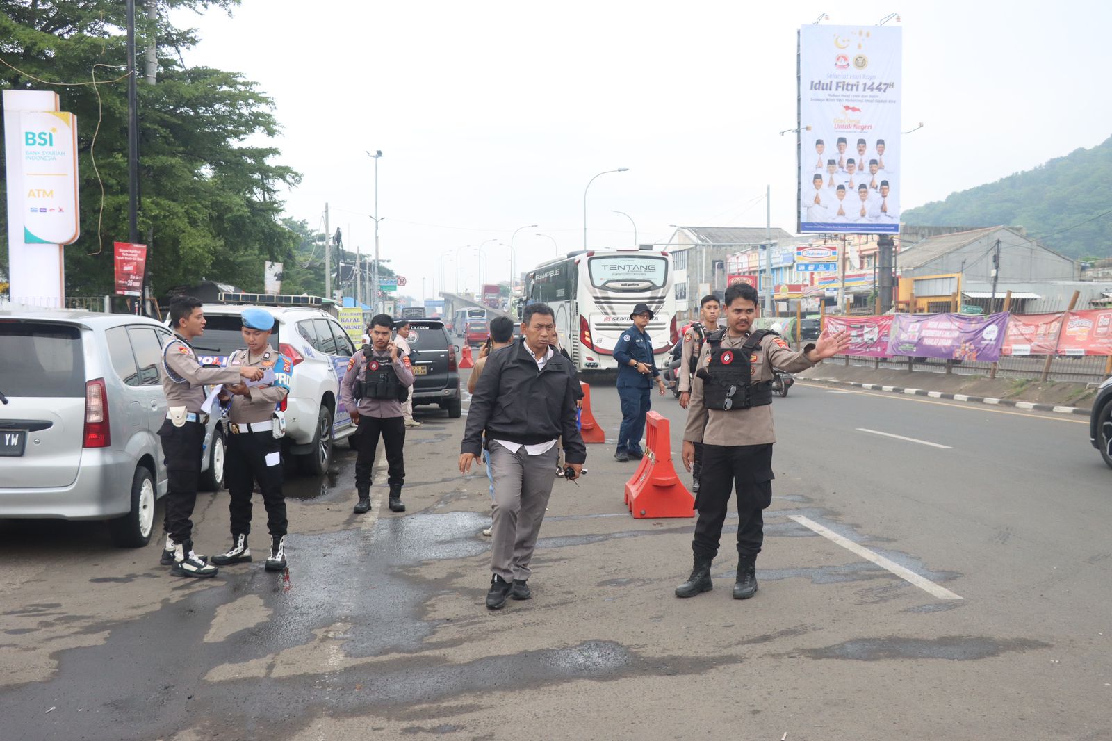 Kapolres Cilegon Polda Banten AKBP Dr. Martua Raja Taripar Laut Silitonga, S.H., S.I.K., M.Si. memimpin langsung kegiatan monitoring situasi di lapangan guna memastikan arus kendaraan tetap berjalan lancar.